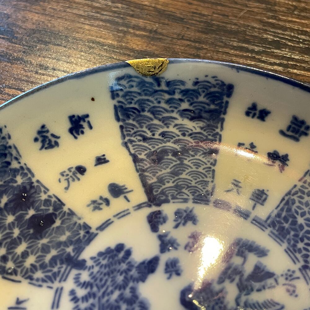 何にでも合わせやすい小皿です。欠けを真鍮で直しています。
